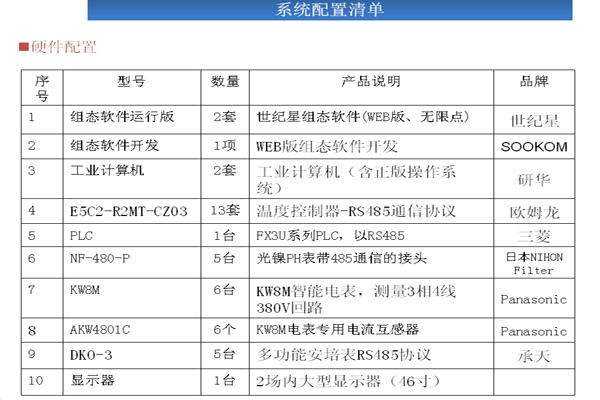 系統(tǒng)說(shuō)明 l1.RS485總線(xiàn)來(lái)采集設(shè)備的各種參數(shù)。通過(guò)PLC與設(shè)備上的溫控表、PH值表、傳感器等以通信、 l2.使用工控組態(tài)軟件來(lái)存儲(chǔ)記錄PLC中采集的各種設(shè)備參數(shù)。 l3.使用KW8M 采集電流、電壓數(shù)據(jù)通過(guò)RS485通信。 l4.世紀(jì)星監(jiān)控系統(tǒng)控制策略的創(chuàng)建是在策略編輯器中實(shí)現(xiàn)的,策略編輯器是一個(gè)基于圖標(biāo),即功能模塊的設(shè)計(jì)環(huán)境.結(jié)合策略工具箱中的功能模塊及其相應(yīng)的參數(shù)配置對(duì)話(huà)框開(kāi)發(fā)策略與配置工作.通過(guò)RS485總線(xiàn)通信采集數(shù)據(jù)連接功能塊。功能模塊也稱(chēng)為軟儀表,其功能與人們熟悉的模擬儀表相同,能完成現(xiàn)場(chǎng)數(shù)據(jù)的采集、處理、顯示、報(bào)警和控制等(如溫度、電流、電壓、PH值、I/O狀態(tài)).構(gòu)建控制策略時(shí),用連線(xiàn)將策略所需的功能模塊連接起來(lái). l5.采集的記錄報(bào)表數(shù)據(jù)發(fā)送到局域網(wǎng)外遠(yuǎn)端,在遠(yuǎn)端也能進(jìn)行數(shù)據(jù)分析。