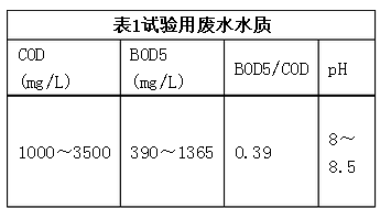 試驗(yàn)用廢水采用某化工廠排出的綜合廢水,該廢水含有季銨鹽、異丙醇等有機(jī)物,日排放量約為20 m3,COD為18 000~25 000 mg/L,BOD5為7 020~9 750 mg/L,BOD5/COD為0.39左右,屬于可生化真溶液廢水。由于該廢水有機(jī)物濃度高,將其適當(dāng)稀釋后作為試驗(yàn)用水,其水質(zhì)見表1。