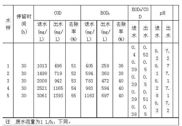馴化掛膜穩(wěn)定后,在所設(shè)定的工況條件下開始試驗(yàn)運(yùn)行,定期取樣分析。處理結(jié)果見表2。