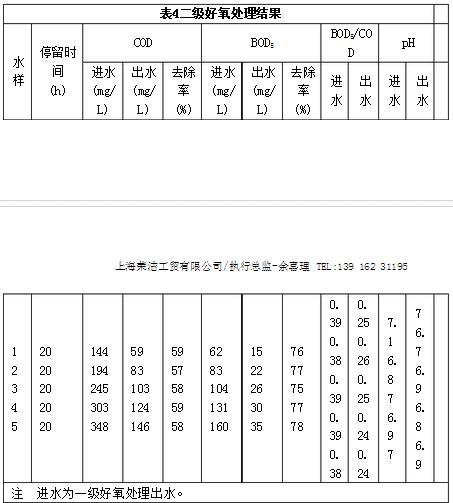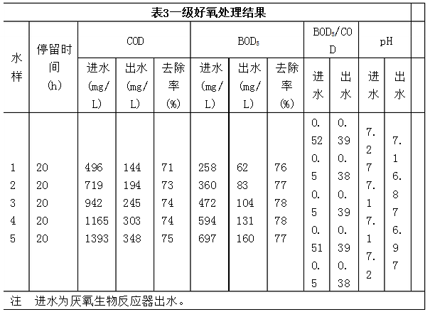 2.2 好氧生物接觸氧化處理 好氧接觸氧化法具有耐沖擊負(fù)荷,無污泥膨脹和維護(hù)方便等優(yōu)點(diǎn)。采用一級好氧生物接觸氧化處理,出水中的COD仍然達(dá)不到排放標(biāo)準(zhǔn),后又增加了一級好氧生物接觸氧化處理(有效容積20 L)。試驗(yàn)結(jié)果見表3和表4。