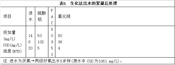 含季銨鹽廢水中COD為2 000~3 000 mg/L,經(jīng)過厭氧→兩級好氧生物接觸氧化處理后,出水COD>100 mg/L,且略有余濁,故進(jìn)行絮凝后處理。分別采用硫酸鋁、聚合鋁(PAC)和氯化鎂為絮凝劑,石灰為助凝劑,試驗(yàn)結(jié)果見表5。