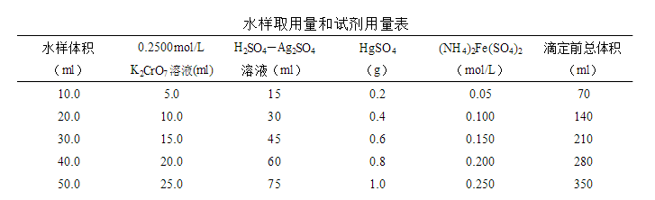 8.2 水樣用體積可在10.00~50.00ml范圍之間,但試劑用量及濃度需按下表進行相應(yīng)調(diào)整,也可得到滿意的結(jié)果。