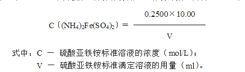 8.7 每次實驗時,應(yīng)對硫酸亞鐵銨標(biāo)準(zhǔn)滴定溶液進行標(biāo)定,室溫較高時尤其應(yīng)注意其濃度的變化。標(biāo)定方法亦可采用如下操作:于空白試驗滴定結(jié)束后的溶液中,準(zhǔn)確加入10.00ml、0.2500mol/L重鉻酸鉀溶液,混勻,然后用硫酸亞鐵銨溶液進行標(biāo)定。