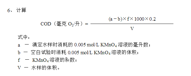 4.7 若水樣用蒸餾水稀釋時,需另取100ml蒸餾水,按步驟4.2~4.5測定空白值,記錄消耗的0.01 mol/L KMnO4溶液的毫升數(shù)V0。