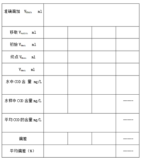 用移液管準(zhǔn)確移取100.00ml水樣,置于250ml錐形瓶中加5ml 1:3 H2SO4,用滴定管準(zhǔn)確加入10.00ml 0.002mol/L KMnO4溶液,搖勻。將錐形瓶放在電爐子上加熱**沸騰,并持續(xù)30min。取下錐形瓶,用移液管移入10.00ml Na2C2O4標(biāo)準(zhǔn)溶液、搖勻,溶液由紅色變?yōu)闊o色,再移入10.00ml Na2C2O4標(biāo)準(zhǔn)溶液,搖勻。趁熱用0.002mol/LKMnO4標(biāo)準(zhǔn)溶液滴定**剛出現(xiàn)粉紅色,并保持30s不褪色,即為終點。記錄數(shù)據(jù)。 4.空白樣耗氧量的測定