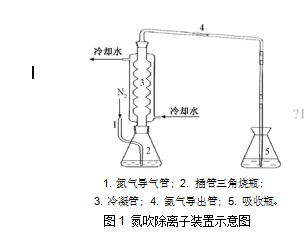 子轉(zhuǎn)化為氨氣,通過(guò)氮?dú)獾拇邓?,將溶液中的氨氣?dǎo)入硼酸溶液吸收。樣品瓶上端安裝循環(huán)冷卻水裝置,防止部分低沸點(diǎn)有機(jī)物揮發(fā)。
