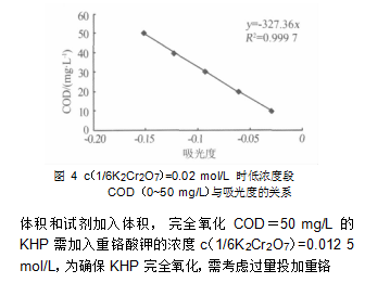 7 )=0.02 mol/L,COD 為 10~50 mg/L 時, 水樣 COD 與吸光度