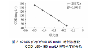 7)=0.05 mol/L, COD 為 50~150 mg/L 時,水樣 COD 與吸光度的變化