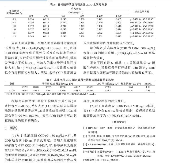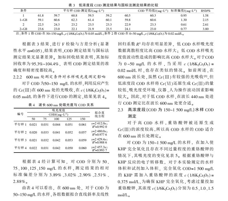 2008 年*家環境保護總局發布了《水質 化學需氧量的測定 快速消解分光光度法》,將 15~1 000 mg/L 的 COD 劃分為 2 個濃度段, 雖然每個濃度段 COD