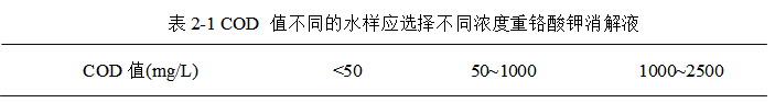 測(cè)定地表水、工業(yè)廢水(包括高鹽廢水)、生活污水的化學(xué)需氧量。根據(jù)水樣化學(xué)需氧量值得的不同,在消解時(shí)應(yīng)選擇不同濃度的重鉻酸鉀消解液進(jìn)行消解。參考表2-1選擇消解液。