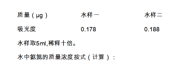 As——水樣的吸光度; Ab——空白試驗的吸光度; a——校準曲線的截距; b——校準曲線的斜率; V——試料體積,ml。結果:水樣氨氮的質量濃度:ρN1=7.4216mg/L、ρN2=7.962mg/L 平均的質量濃度:ρN=7.6918mg/L