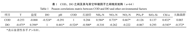 海水中 DO 的主要來源是大氣中氧的溶解,其次來自于海洋生物,尤其是浮游植物光合作用時所放出的氧。表 1 中,DO 值主要與溫度、pH、COD、石油烴、Chl-a、大腸菌群、鹽度等指標(biāo)顯著相關(guān),相關(guān)系數(shù)分別為-0.475、0.441、-0.524、-0.5、-0.543、-0.372、0.394。DO 與溫度明顯負(fù)相關(guān), 符合水體中溶解氧與溫度分布呈反比例的一般規(guī)律(見表 1) 。DO 與 pH 顯著正相關(guān),則反映了有機(jī)污染物氧化分解,消耗氧氣,并導(dǎo)致 pH 值下降的過程。DO 與石油烴明顯負(fù)相關(guān),可能與石油烴降解耗氧及石油烴污染易在水面形成油膜,影響水-氣界面氧氣交換的作用有關(guān)。盡管亞熱帶河口海區(qū)由于受溫度、光照、及高營養(yǎng)鹽含量等因素影響,往往具有較高的初級生產(chǎn)力(高 Chl-a值) ,浮游植物在光合作用中釋放出大量氧氣,但營養(yǎng)鹽水平較高的海區(qū),其耗氧污染物負(fù)荷也較高,污染物降解耗氧速度遠(yuǎn)大于生物作用生成氧氣的速度, 這也是 DO 與 Chl-a 呈現(xiàn)負(fù)相關(guān)的主要原因。大腸菌群指標(biāo)常用來表征微生物降解有機(jī)物能力,有機(jī)污染程度越高,大腸菌群則越高,這也解釋了 DO 與大腸菌群顯著負(fù)相關(guān)的主要原因 [21] 。DO 與鹽度顯著正相關(guān),主要為鹽度越高,則越靠近外海,其污染負(fù)荷越小,而 DO 含量則越高。